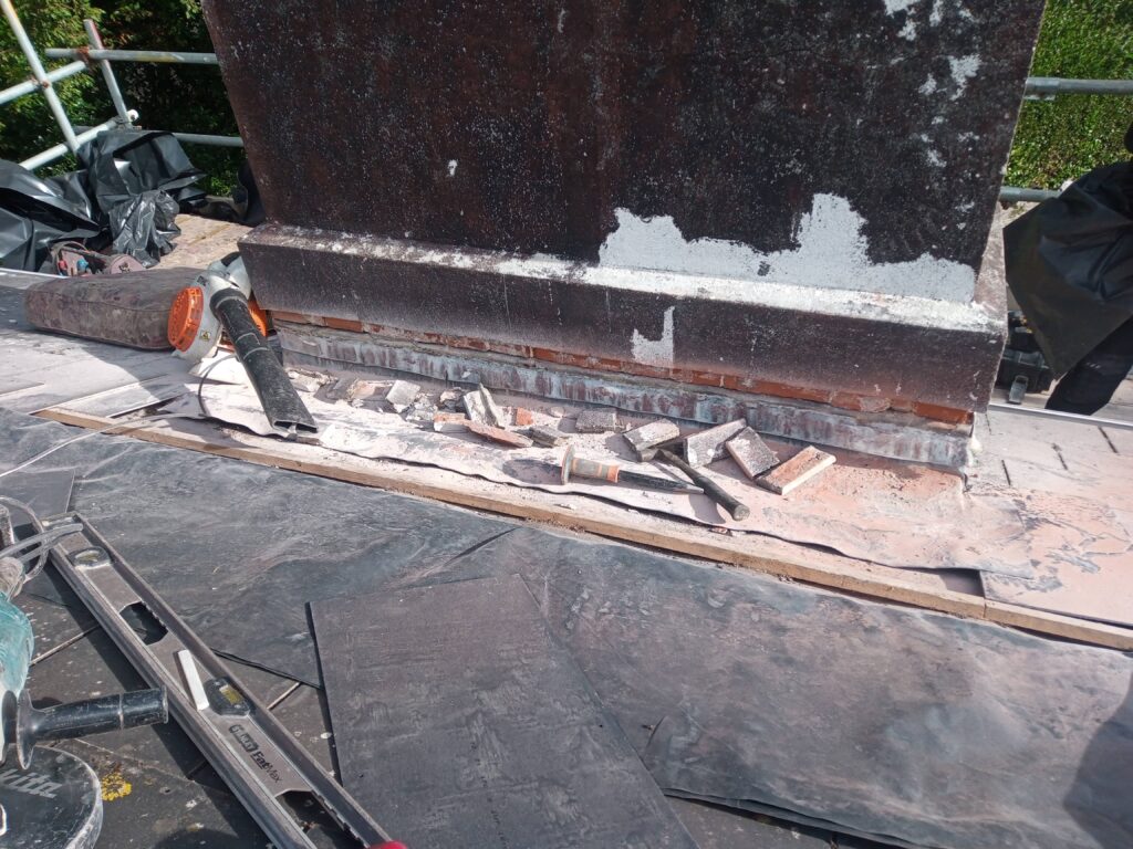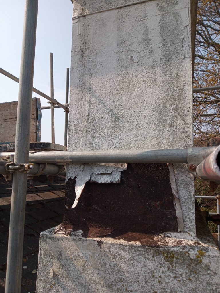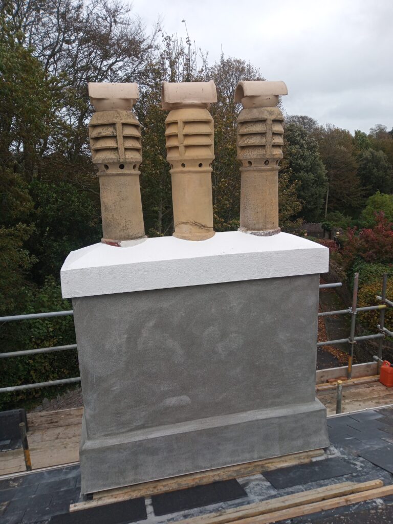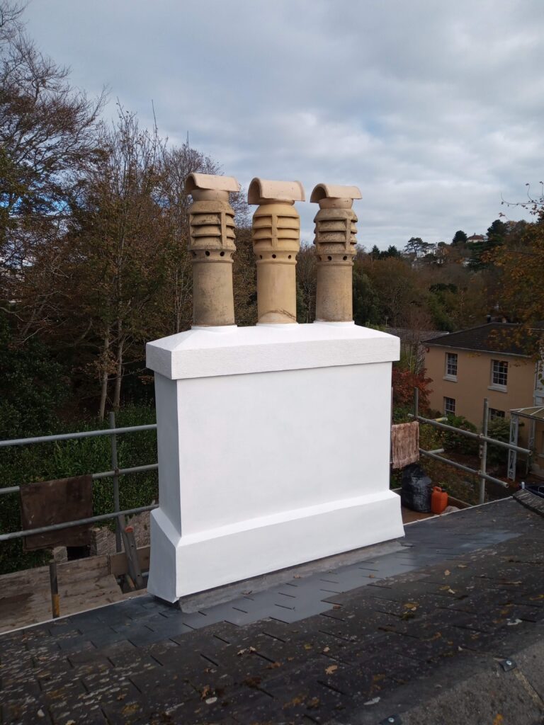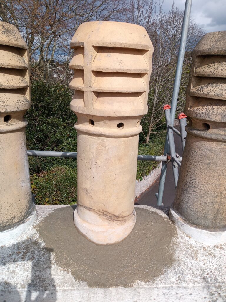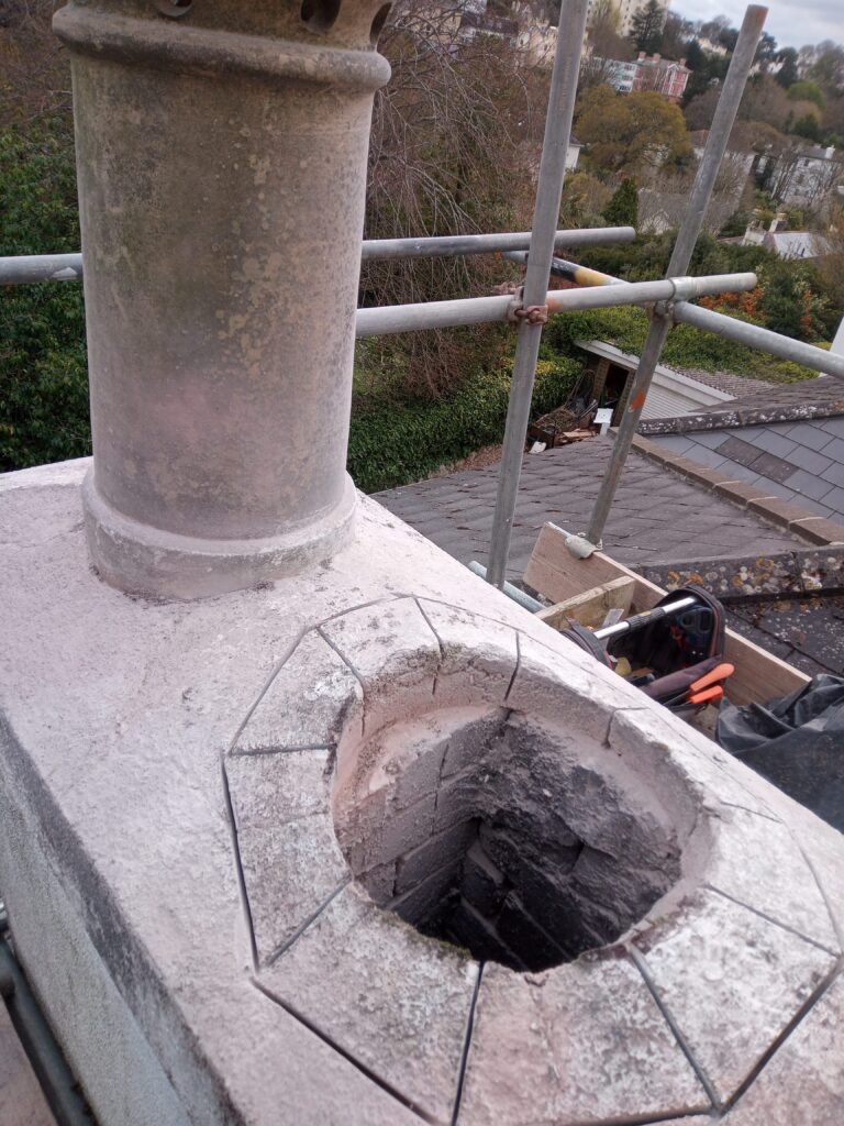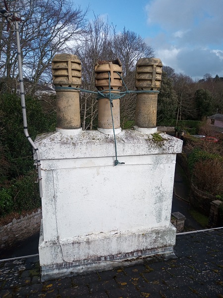This chimney was located in a conservation area of Torquay, it had a loose centre pot. We lashed it up with rope to make safe as a temporary measure before scaffolding was erected. The chimney had several leaks and treated render which was now delaminating.