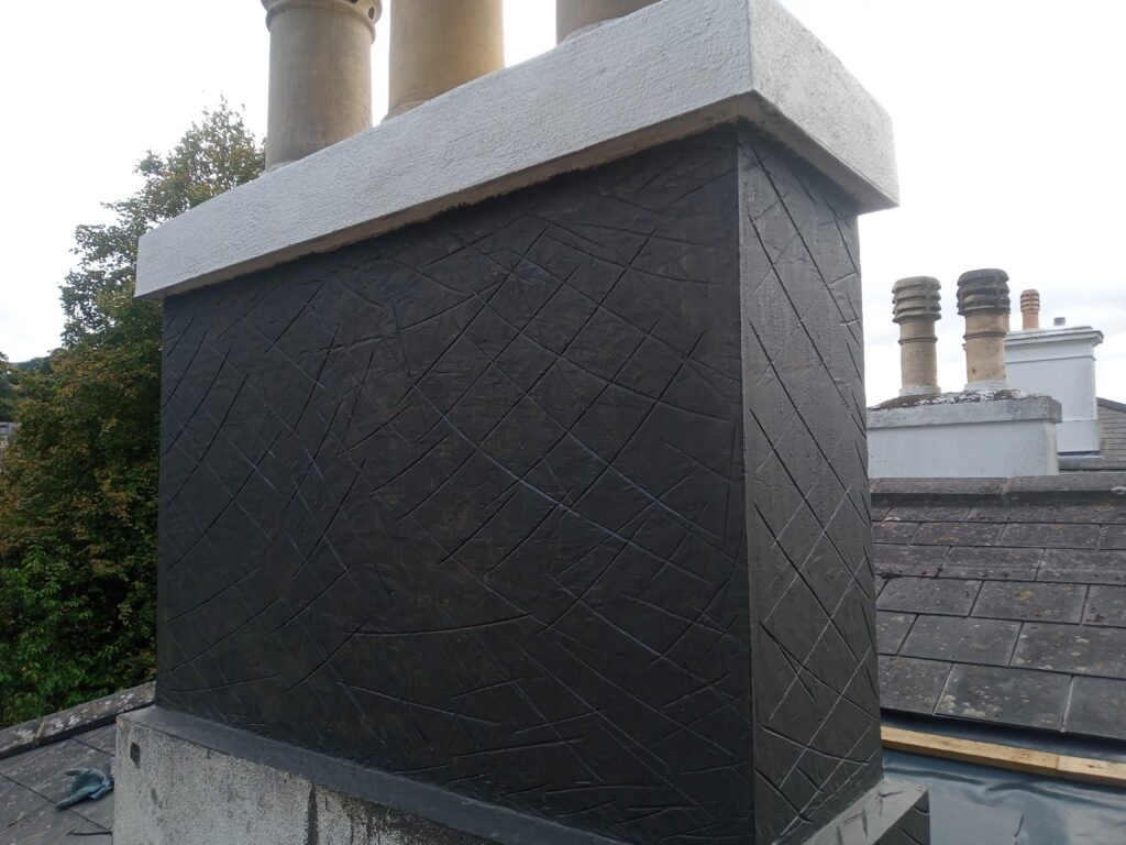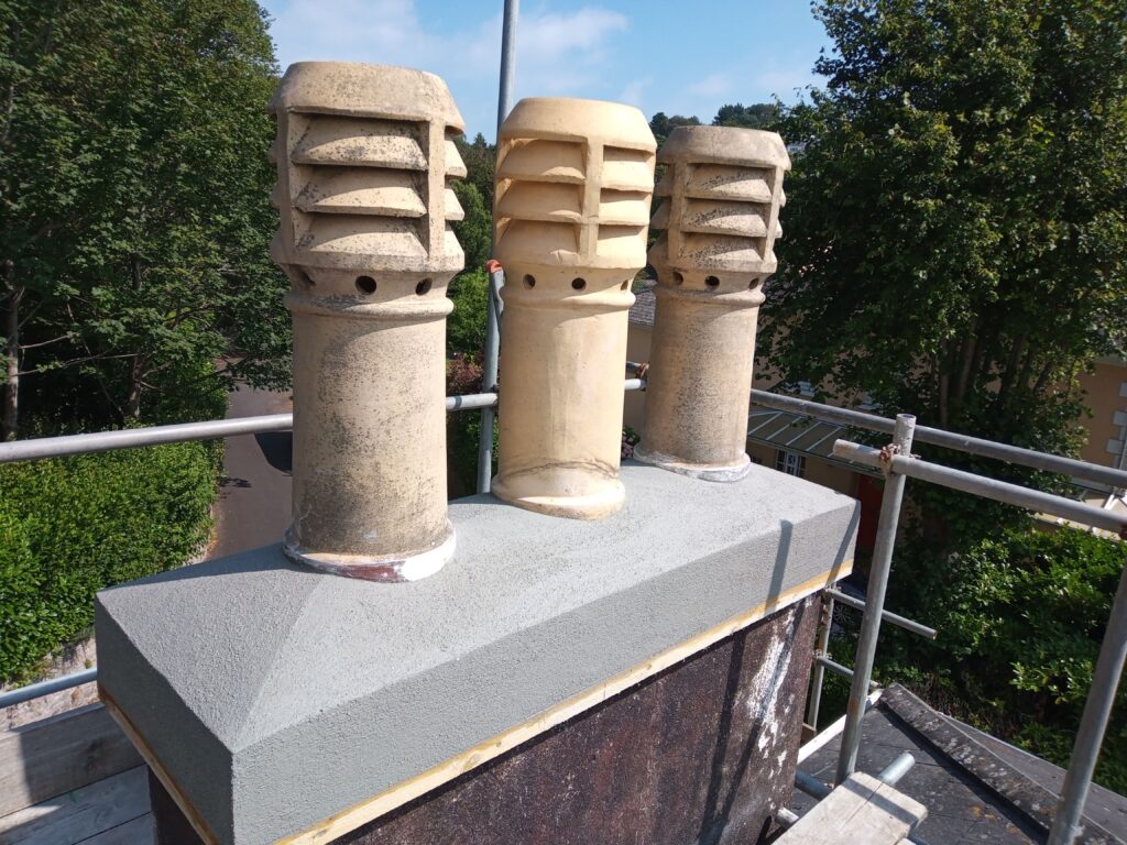 We supplied and fixed a reclaimed centre louvered pot and correct hooded clay cowls. The bituminous treatment was carefully scraped off and prepared for rendering. During this work the lead flashings and surround slates were repaired. The chimney was traditionally lime rendered and then a suitable paint was applied to allow the render to breathe.